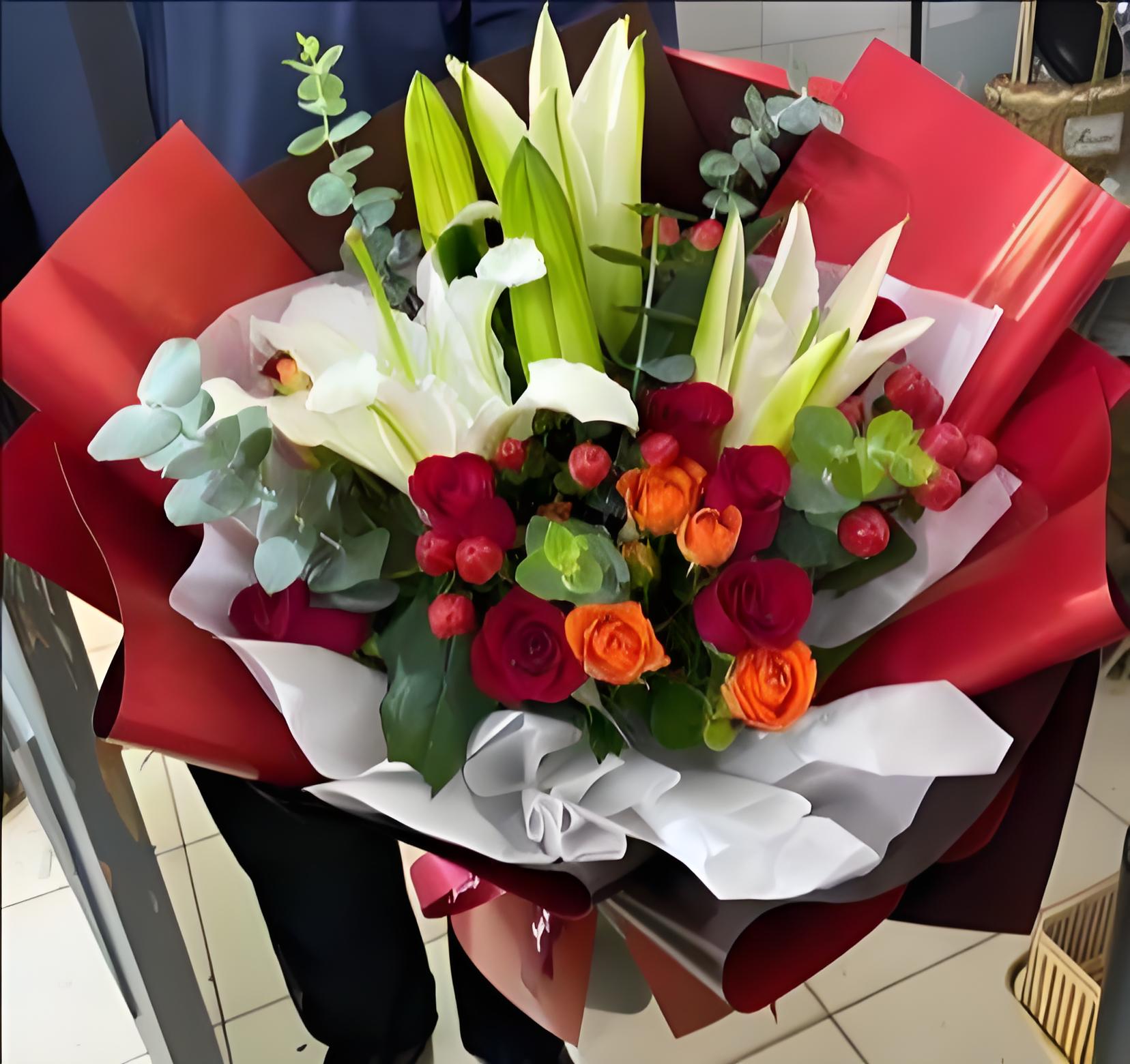 东莞茶山镇花店包11枝红玫瑰、2枝多头白百合、6枝橙色多头玫瑰、红豆、尤加利叶